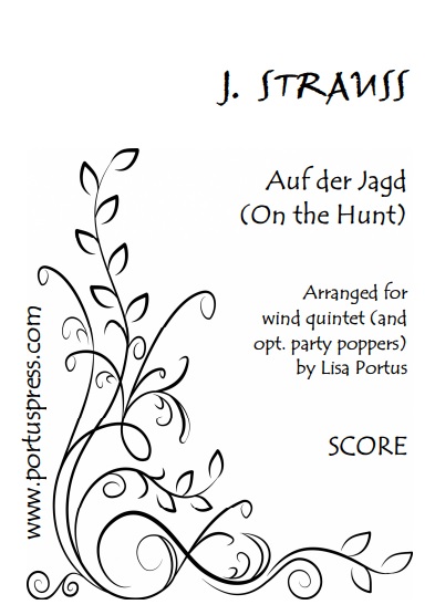 Strauss commonly extracted musical material from his larger works to create standalone concert pieces. Auf der Jagd is a galloping, fast polka which depicts very vividly a hunt in full cry complete with a ‘gunshot’- one of those attention-grabbing sound effects that Strauss was fond of using. In this arrangement the ‘gunshot’ is actually a party popper (activated by the flute), but this is optional and the players are cued to stamp their feet instead if a party popper is not used.